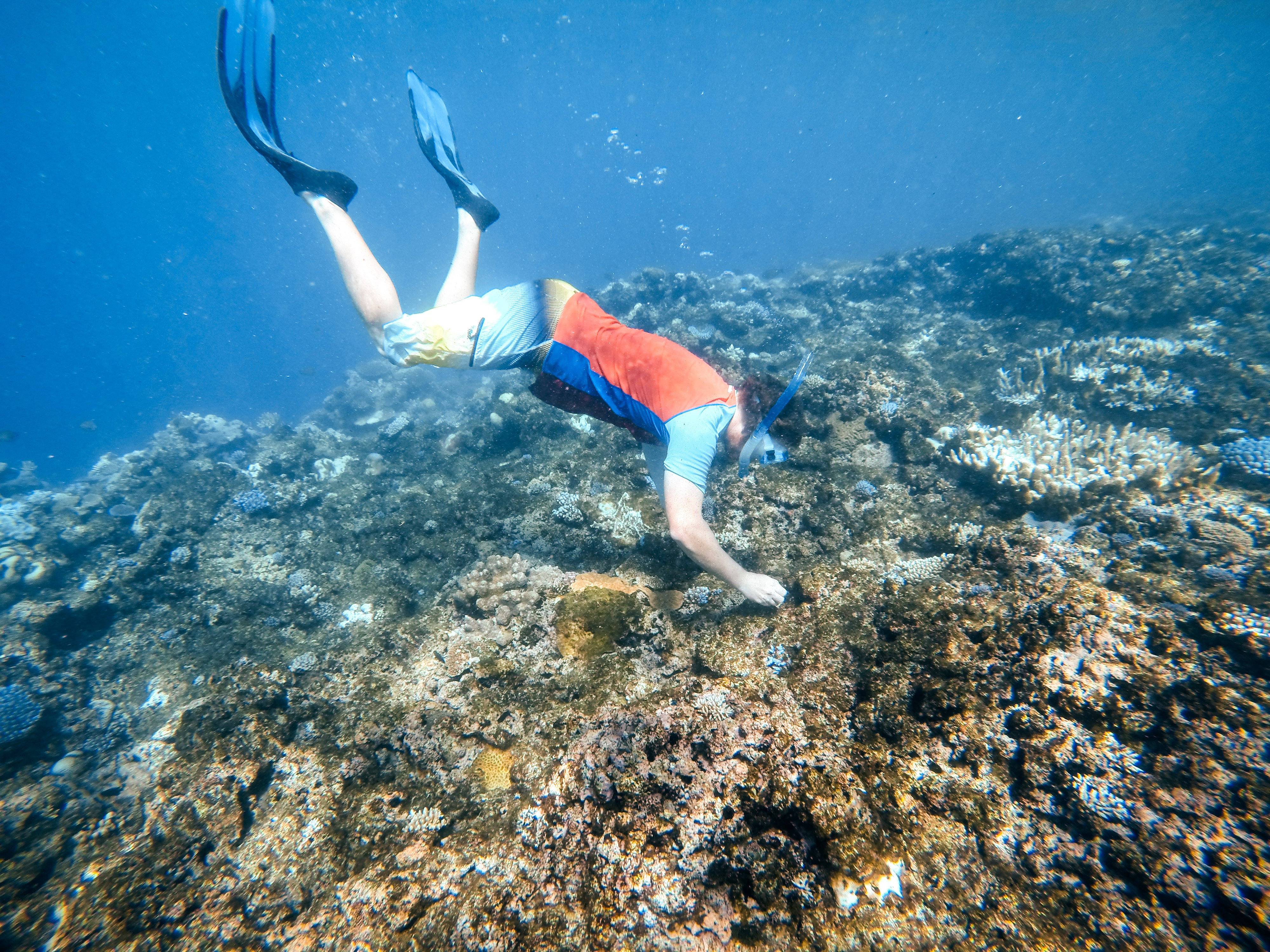Dr Tim Haggitt inspects a bleached coral reef in far northeast Fiji.