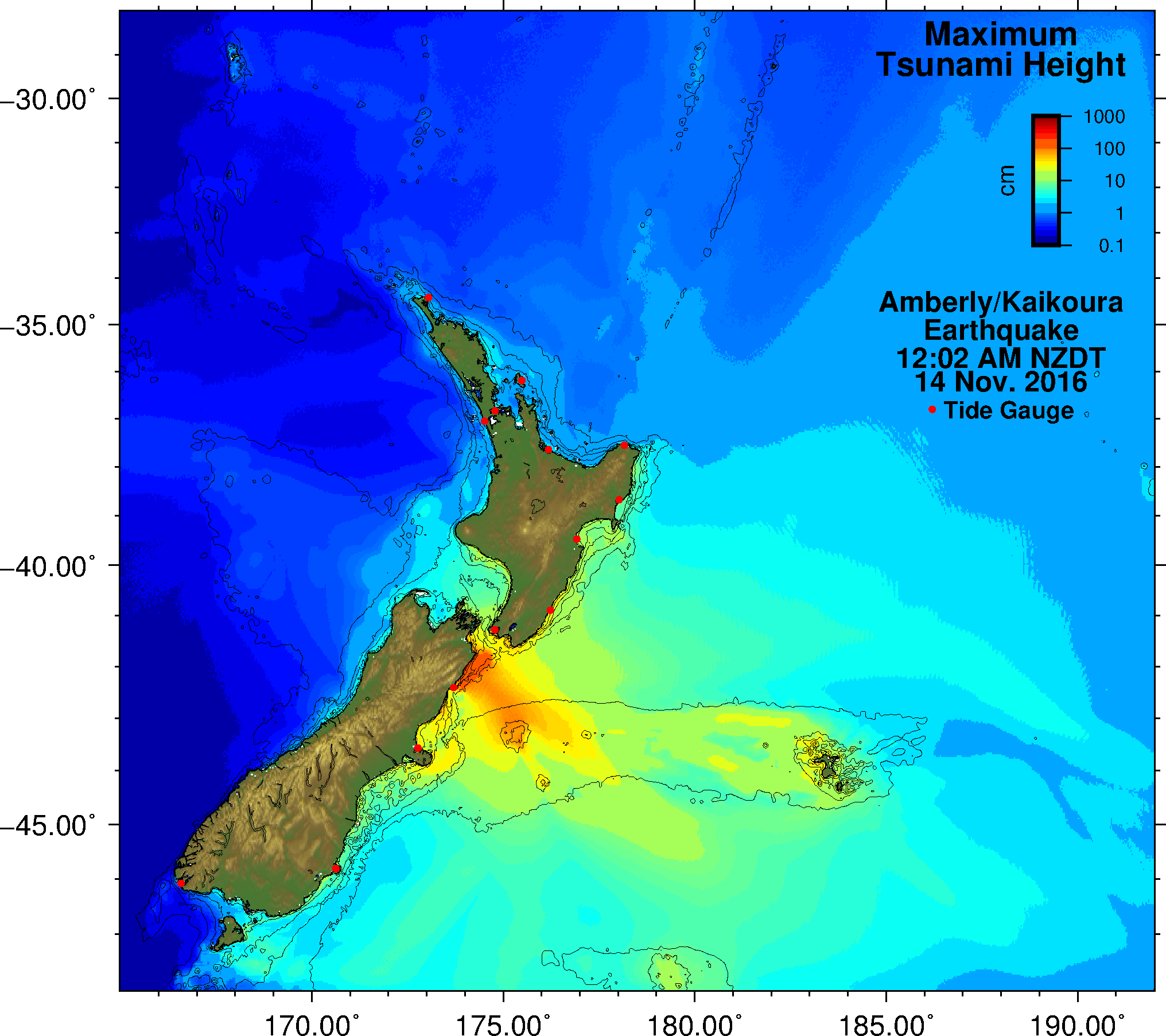 The image below shows a computer simulation of the maximum tsunami height around New Zealand.