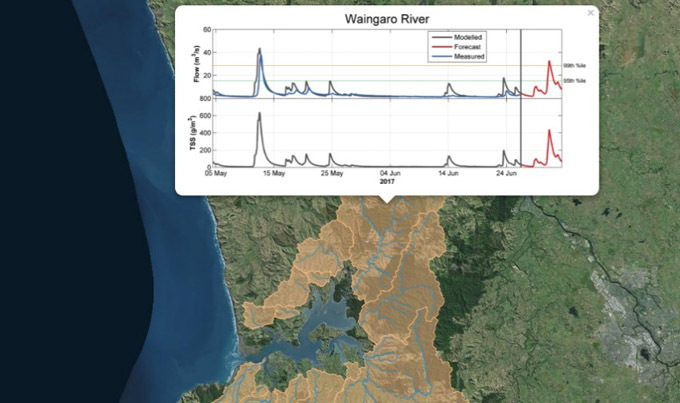 As part of a Callaghan Innovation R&D grant, a hydrodynamic model was developed to produce hindcasted and forecasted river flow and total suspended solids (TSS) predictions accounting for 95% of the Whaingaroa Harbour basin area. The model was calibrated to measured Waingaro River flow and TSS data, and was extended to account for remaining 12 largest catchments of the harbour. Daily model runs produce hourly model outputs which are published as an interactive online resource, with the user able to view a time-series of flow and TSS predictions for a selected catchment. The model has also been extended to predict river flow and TSS for the entire Waikato region.